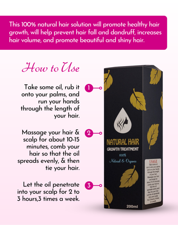 This 100% natural hair solution will promote healthy hair growth, will help prevent hair fall and dandruff, increases hair volume, and promote beautiful and shiny hair.